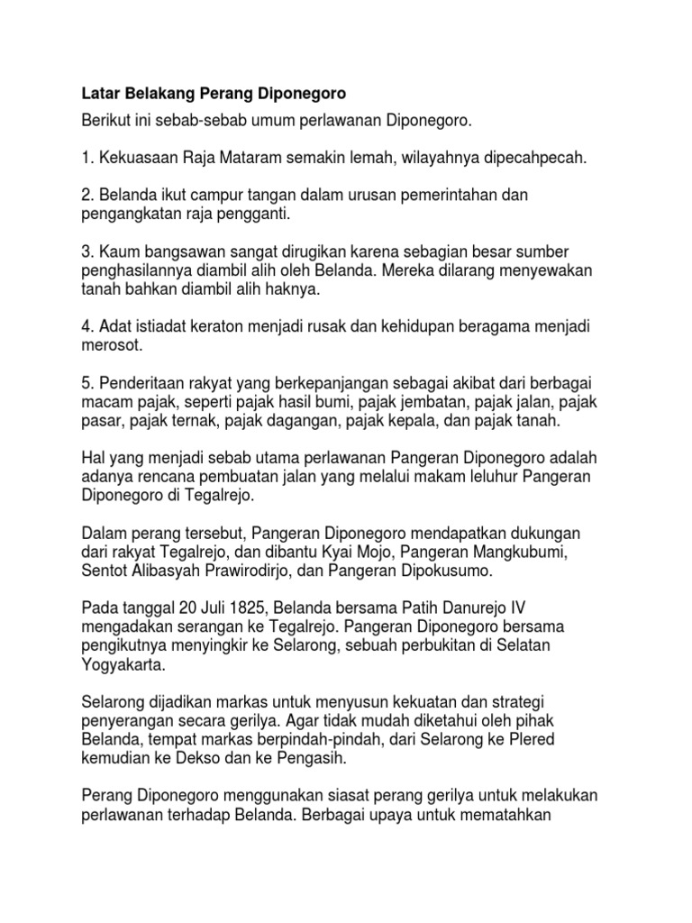 Latar Belakang Perang Diponegoro Docx from imgv2-2-f.scribdassets.com Pada 29 oktober 1824, pangeran diponegoro mengadakan pertemuan di rumahnya yang berada di tegalrejo untuk membahas mengenai kemungkinan pemberontakan pada pertengahan agustus. Bendara pangeran harya dipanegara atau biasa kita kenal dengan sebutan diponegoro adalah salah satu dari sekian banyak pahlawan nasional republik indonesia dan termasuk pahlawan nasional dari jawa.beliau lahir di kesultanan yogyakarta pada tanggal 11 november 1785 dan meninggal di makassar, hindia belanda, pada tanggal 8 januari 1855 pada umur 69 tahun. Dibawah pimpinan pangeran diponegoro terjadinya perlawanan rakyat pada 1825 hingga 1830 yaitu satu perlawanan kepada pemerintah kolonial belanda. Kajian sejarah pangeran dipanegara sudah cukup banyak dilakukan oleh para peneliti sejarah. Perlawanan pangeran diponegoro terhadap belanda menjadi dasar dan latar belakang dari perjuangan rakyat indonesia untuk memperjuangkan kemerdekaan, persatuan dan martabat bangsa.penangkapanan diponegoro yang diakibatkan oleh pengkhiatan (walaupun sebelumnya dijanjikan keselamatan atas dirinya), merupakan momen bersejarah bagi bangsa jawa. Oleh rakyat, pangeran diponegoro diangkat menjadi sultan dengan gelar sultan abdulhamid cokro amirulmukminin sayidin panotogomo kalifatullah tanah jowo. Salah satu perlawanan rakyat indonesia terhadap penjajahan kolonial belanda adalah perang diponegoro. Babad diponegoro merupakan kumpulan puisi jawa (tembang macapat) setebal 1.170 halaman folio yang menceritakan sejarah nabi dan sejarah pulau jawa yang ditulis langsung oleh pangeran diponegoro sendiri.